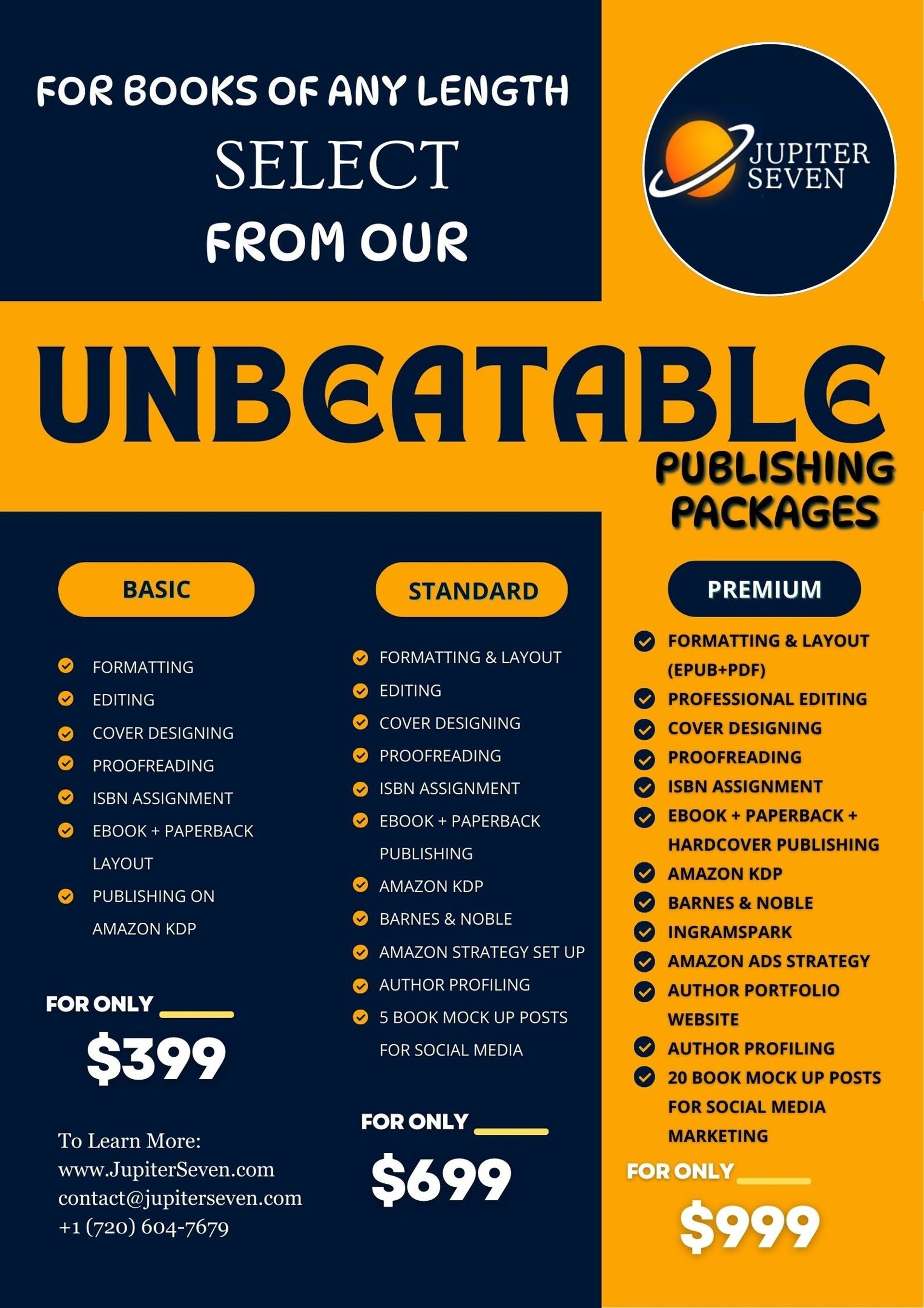 Welcome to JUPITER SEVEN PUBLISHING, where ideas soar and words come alive. Our talented team of ghostwriters and storytellers transforms your imagination and life experiences into compelling narratives. We don’t just craft words; we create vivid, emotion-filled imagery that brings every story to life. Beyond writing, we elevate your book with comprehensive publishing and marketing services.